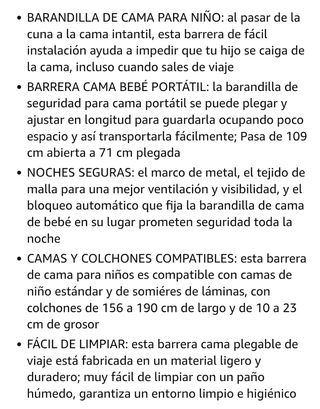 barrera de cama infantil para proteger a los más pequeños. Se encuentra en buen estado, lista para usar. - Ideal para camas de matrimonio o individuales. - Fácil de instalar y quitar. - Incluye dos unidades. 10€ cada unidad