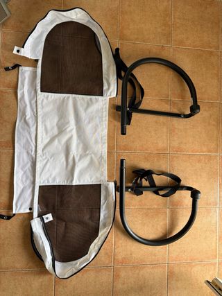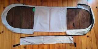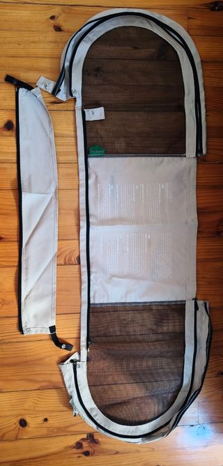 Funda para barrera de seguridad de la marca Babyhome. Es de color beige con detalles en negro y malla. - Incluye una pieza adicional. - Cierre con botones a presión.
