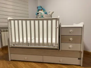 Cuna convertible con un diseño moderno y funcional, ideal para adaptarse a las necesidades cambiantes de tu bebé. - Estructura principal en blanco con detalles en madera clara. - Barrera de seguridad. - Cajones integrados para almacenamiento. - Convertible en cama y escritorio. Cuna convertible, crece con tu pequeño, transformándose en cama, escritorio y mesita de noche. Tiene apenas 3 meses de uso, se vende con colchón (y dos juegos de sábanas si se quisieran.) Es una cuna con una valla que se puede subir y bajar, también tiene la posibilidad de ser móvil para mecer al bebé y dejarla estática. Los cajones son de gran profundidad