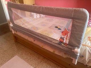 Preciosa barrera de seguridad para cama infantil de la marca Safety. Está en muy buen estado y es perfecta para evitar que los más pequeños se caigan de la cama. - Diseño ligero y compacto. - Material transpirable y resistente. - Abatible