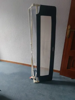 Barrera de seguridad para cama infantil. Ayuda a prevenir caídas durante la noche. - Diseño de malla transpirable. - Estructura plegable para fácil almacenamiento. - Ruedas en la base para movilidad. Con signos de uso, un poco descosida en un lado al final pero no afecta a su uso.