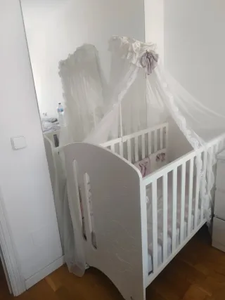 Cuna de bebé en color blanco, ideal para el descanso del recién nacido. Su diseño clásico se adapta a cualquier habitación infantil. - Estructura de madera. - Barreras de seguridad. - Ruedas para facilitar el movimiento. Con uso y con pequeños roces y defectos pero para el apaño va genial, una barrera la tengo atada con cuerdas porque habría que ponerle unos “soportes”