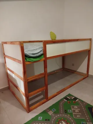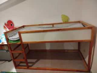 Cama infantil de madera de IKEA, ideal para habitaciones de niños. - Estructura de madera resistente. - Diseño seguro con barreras protectoras. - Escalera para acceder a la cama superior. - Incluye colchón en buen estado con funda lavable. A desmontar y recoger en Moscari
