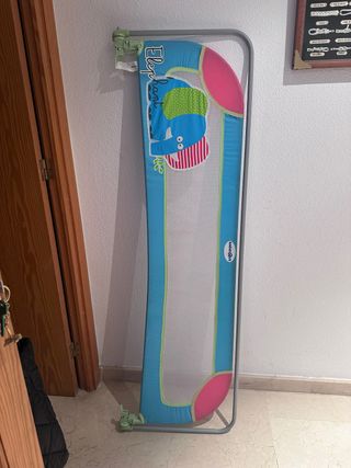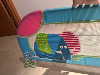 Barrera de seguridad para cama infantil con un divertido diseño de elefante. - Color azul con detalles en rosa y verde. - Tejido de malla transpirable. - Estructura metálica. - Incluye sistema de anclaje. - Plegable - Instalación sencilla debajo del colchón -Muy cómoda ya que permite hacer la cama sin quitar la barrera