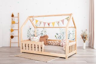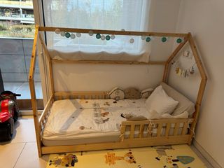 SOLO 1 MES DE USO. Se vende por falta de espacio por llegada de hermano. Cama estilo Montessori para niños, fabricada en madera natural. Su diseño bajo permite fácil acceso para los más pequeños. 90X190 Se vende con colchón pero sin ropa de cama. - Estructura de madera. - Diseño de casa. - Incluye barreras de seguridad.