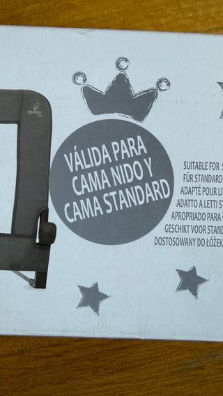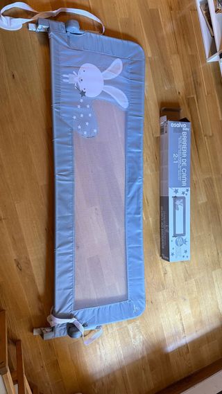 Barrera de cama infantil de la marca Asalvo. - Color gris claro con diseño de conejito y estrellas. - Fabricada con tejido de malla y bordes acolchados. - Incluye correas de sujeción.