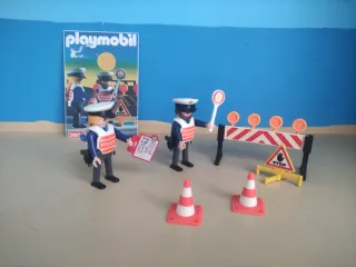 Set de Playmobil de la policía de tráfico. Como nuevo siempre en vitrina completo con caja recortada e instrucciones. - Incluye dos figuras de policía. - Accesorios de señalización vial como conos y barrera. - Caja original incluida.