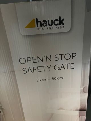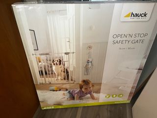 Barrera de seguridad de la marca Hauck, modelo Open'n Stop. Diseñada para adaptarse a huecos de entre 75 y 80 cm. - Color blanco. - Fácil instalación. - Ideal para delimitar espacios.