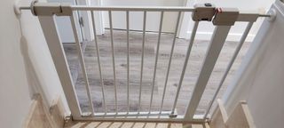Barrera de seguridad metálica blanca, ideal para escaleras y para mantener a los niños a salvo. Se ajusta a diferentes anchos. - Estructura de metal. - Color blanco.