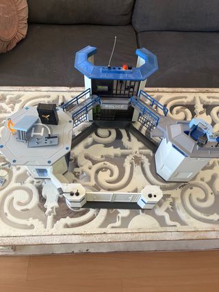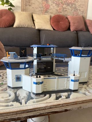 Set de comisaría de Playmobil, ideal para recrear escenas de acción y aventuras. - Incluye torre de vigilancia y entrada principal. - Barreras y rejas para asegurar la zona. - Detalles como el símbolo de policía en las columnas.