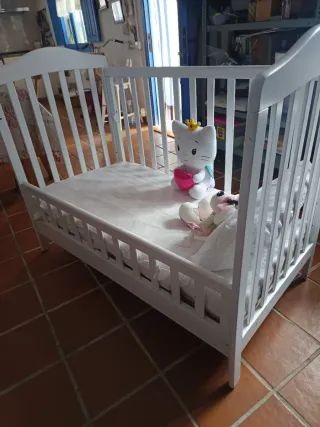 Cuna de bebé con opción de colecho, ideal para tener a tu pequeño cerca. Su diseño combina madera y blanco, aportando un toque cálido y moderno. - Estructura de madera. - Barrera blanca. - Incluye colchón. - Incluye edredón - Incluye funda edredón y almohada Precio original cuna: 200 euros sólo la estructura de la cuna