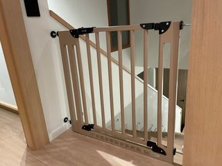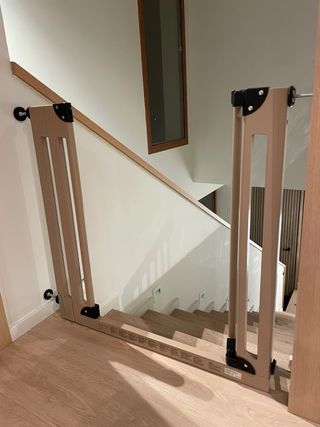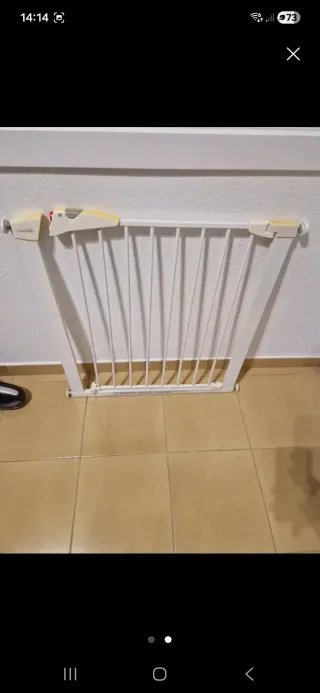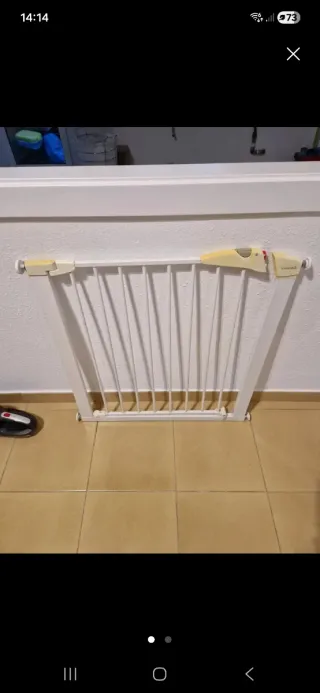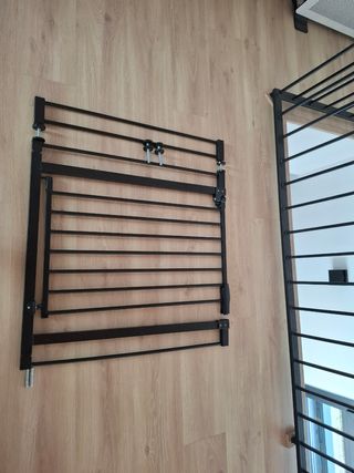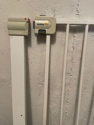 Barrera de seguridad Safety 1st para bebes o mascotas. Con cierre a presión sin necesidad de taladrar la pared. Está nueva ya que mi hija al final no la necesitó. Mide mínimo 73cm y máximo 80cm. Dispongo de dos unidades.