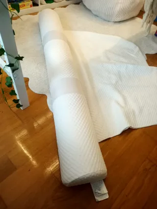 Barrera de seguridad para la cama, ideal para evitar caídas. - Es de espuma asi que no se dan golpes. - impermeable - la parte del plástico por los lavados en algunas partes esta roto. Ver foto.