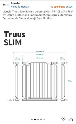 Preciosa barrera de seguridad para escaleras Lionelo Truus Slim, nueva y sin usar. Ideal para proteger a los más pequeños. Comprada en Amazon hace dos meses. - Modelo: Lionelo Truus Slim. - Color gris. - Medidas: 75-105 x 3 x 76,5 cm. - Sistema de cierre automático AutoStop. - Fácil instalación. Se vende por no haberla necesitado instalar. Precio original 54.85 euros