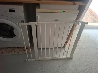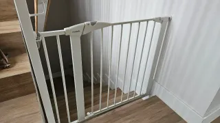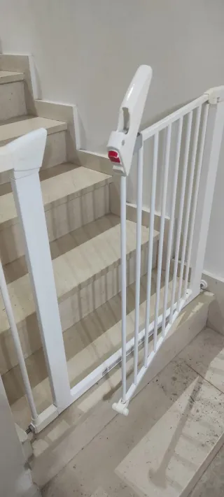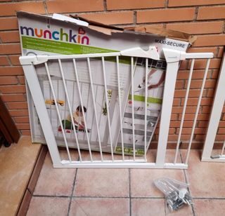 Barrera de seguridad blanca para proteger escaleras. Si te llevas las dos barreras protectoras las dejo a 25 euros cada una. - Estructura de metal. - Mecanismo de cierre. - Diseño de barrotes verticales. Su sistema de 4 puntos de presión te permite un montaje fácil y rápido sin perforar tus paredes. Bloqueo sistemático con su cierre automático. Adaptable en puertas de paso y al pie de escalera de 82 a 89 cm. Marca del producto: MUNCHKIN Uso del producto: Protección para niños. Tipo de fijación: Por presión sin agujero en la pared.