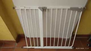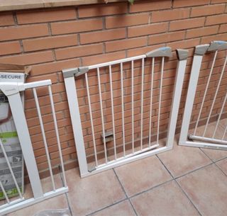 2 Barreras de seguridad blanca, ideal para escaleras o pasillos. Fácil montaje sin tornillos. Se adapta a apertura de entre 76 y 82 cm. Una de ellas con extensión de 82 a 89cm. Se venden también por separado. La que tiene extensión por 26 y la pequeña por 19.