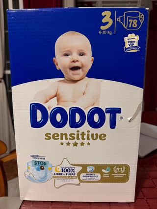 Paquete de pañales Dodot Sensitive talla 3 nuevos sin abrir se entregan en Sevilla capital a domicilio gratis 21 euros cada caja - Diseñados para bebés de 6 a 10 kg. - Barrera Stop Fugas para mayor protección. - Hasta 100% libre de fugas. - Cuidado de la piel sensible. - Barrera Duo Protect en las piernas. - Ultra Suave.