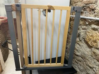 Preciosa barrera de seguridad para puerta . Se encuentra en buen estado. - Abertura en ambas direcciones . - Cierre automático. - Doble seguro de cierre. - Extensible de 70 a 98 cm. - Apta para mascotas .