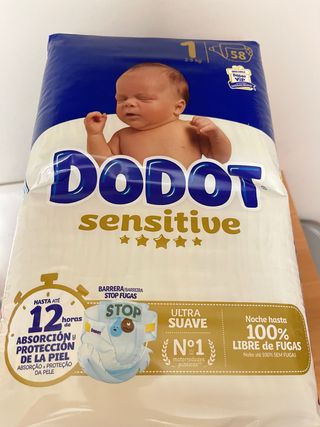 Lote de pañales Dodot Sensitive, talla 1, para bebés de 2 a 5 kg. El paquete contiene 58 unidades. - Talla 1 (2-5 kg). - Modelo Sensitive. - 58 unidades por paquete. - Absorción y protección de la piel hasta 12 horas. - Ultra suave. - Barrera anti fugas.