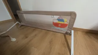 Barrera de cama grande. Es bastante alta y se queda plegada para poder meter al peque mejor en la cama. Tiene un poco desgaste de un lado pero no lo había visto hasta quitarla. Por lo demás está perfecta. Es fuerte y grande para que el peque no se caiga de la cama. Medidas: 150x58