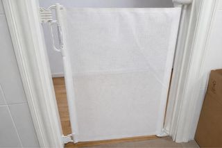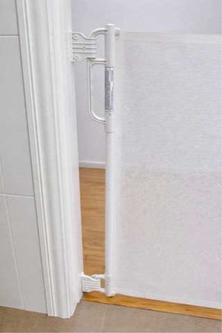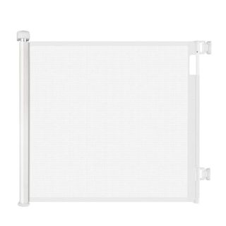 Barrera de seguridad enrollable para puertas, ideal para mantener a los niños seguros. - Color blanco. - Material de malla resistente. - Mecanismo de enrollado.