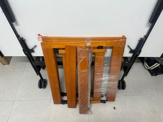 Barrera de seguridad de madera para puertas o escaleras. - Material: Madera natural. - Diseño de barrotes verticales. - Incluye herrajes de montaje. - A estrenar (sin caja) - No se abre, no es puerta.