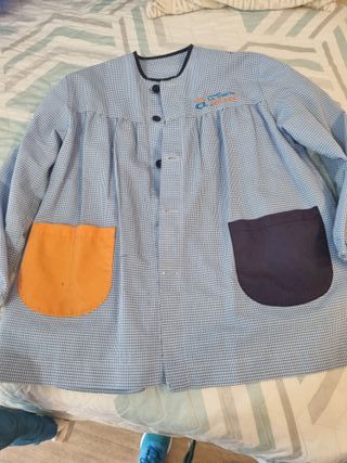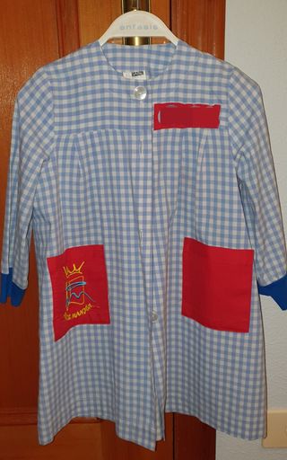 Bata de colegio de Santa Maria La Nueva, talla 8 modelo nuevo, le faltaría un botón. - Cierre con botones. - Dos bolsillos delanteros de diferentes colores (naranja y morado). - Cuello con ribete azul marino.