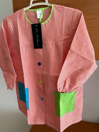 Preciosa bata infantil de cuadros vichy en color verde y blanco,ideal para el colegio. - Talla 4. - Bolsillos de colores. - Detalle bordado en un bolsillo. - Cierre de botones. De largo 56 x 45 de ancho. Hay bolsitas a juego.