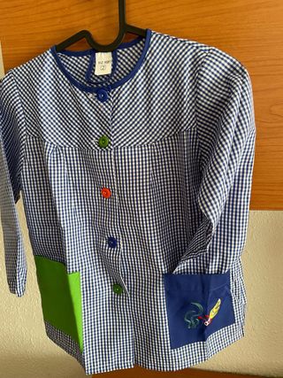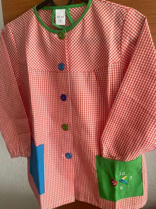 Preciosa bata escolar ideal para el colegio.Es perfecta para el día a - Bolsillo decorado con un simpático personaje. - Detalle de ribete verde. - Cuello rojo a contraste El precio es de una unidad Talla 6. Bata de verano de regalo.
