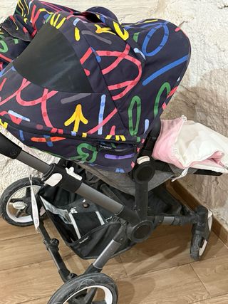 Carro gemelar Bugaboo Donkey 5 en perfecto estado. Ideal para dos bebés. - Color negro con estampado de colores. - Incluye capota. - Capazo y silla. - Ruedas todoterreno.