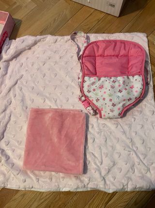 Muñeco de bebé de la marca Antonio Juan. Viene con un gorrito y un conjunto de ropa y manta, y un accesorio para llevarlo colgado. Como nuevo. Es pesado y muy real Caja original Comprado en Corte Inglés - Gorrito blanco con topitos rosas. - Conjunto de pantalón y calcetines a juego con topitos rosas. - Ropa de algodón.