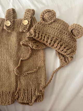 Conjunto de ropa tejido a mano, ideal para sesiones fotográficas de bebés o para muñecos reborn. El diseño imita a un osito. - Color camel. - Incluye gorro con orejas. - Cierre con botones de madera en los tirantes. - osito