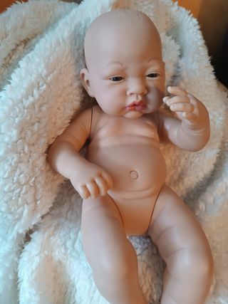 Muñeco bebé reborn con aspecto muy realista. Ideal para coleccionistas o como regalo especial. - Cuerpo de tela peso real de 2.200 con movimiento como bebé real en la cabeza - Pelo injertado. - Ojos de cristal. mide 43 cm es muy bonita no envío por correos
