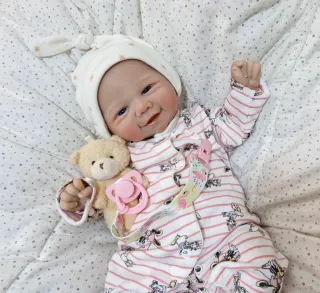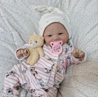 Muñeca Reborn con aspecto muy realista, ideal para coleccionistas o como regalo especial. Esta bebé mide 47cm y pesa 2,500 - Pelo rubio. - Vestido blanco con topos azules.