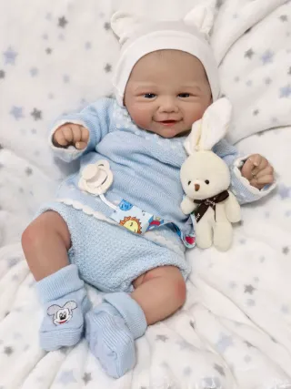 Precioso bebé reborn con aspecto muy realista. - Cuerpo de tela. - Pelo injertado. - Ojos azules.