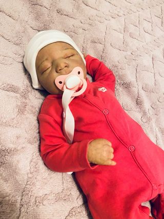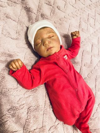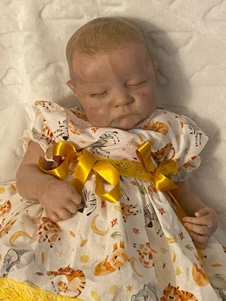 Precioso bebé reborn con detalles muy realistas. - Cuerpo de tela y extremidades de vinilo. - Pelo pintado, pestañas injertado. - Ojos cerrados.