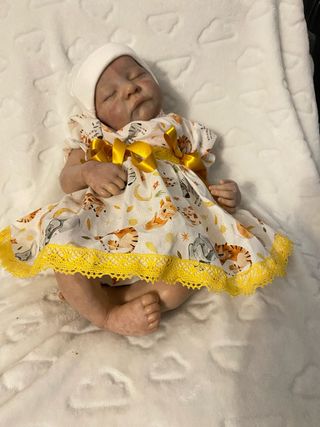 Muñeca realista de bebé. Con todos sus detalles. - Vestido blanco con estampado de animales y lazos amarillos. - Adorno de encaje amarillo en el bajo del vestido. - Gorro blanco a juego.