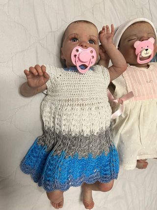 Preciosas muñecas bebé reborn, dos unidades. Son ideales para coleccionistas o para el juego infantil. - Se venden juntas. - Tienen el pelo rubio y los ojos azules. - Están vestidas con ropa delicada.