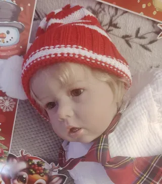 Precioso bebé reborn con detalles muy realistas. - Pelo rubio. - Ojos marrones. - Incluye gorro de punto rojo y blanco. - Lleva una corbata a cuadros.