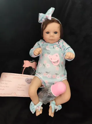 Muñeca bebé reborn con certificado de autenticidad. - Incluye chupete rosa. - Viene con un conjunto de ropa de bebé. - Incluye pulseras para tobillos. - Incluye un biberón. - Certificado de Adopción. - Peso aprox 800 gr -Material vinilo y cuerpo de tela