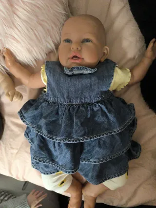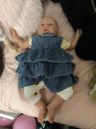 Muñeca realista parecida a los reborn con coletas. Mide 45 cm. La ropa podría cambiar. Tiene una pequeña marca de boli en casa brazo