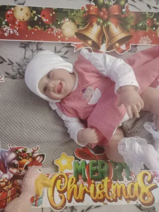 Precioso bebé reborn con detalles muy realistas. - Pelo rubio. - Ojos marrones. - Vestido a cuadros rojos y blancos.