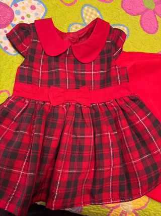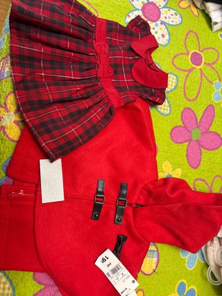 Conjunto de ropa para bebé inspirado en Caperucita Roja, talla de 3 a 9 meses. ideal para Reborn y que tu peque luzca de cuento. - Vestido a cuadros rojos y negros con detalles de lazo. - Abrigo rojo a juego con cierres decorativos. - Incluye etiquetas originales.