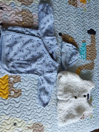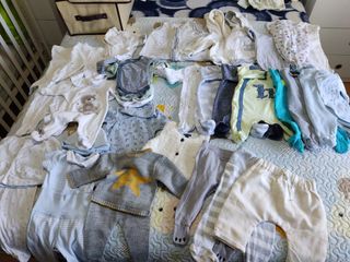 Lote de ropa de bebé compuesto por 2 bodys y dos pantalones de 50 cms, día pijamas reborn nacido, 4 bodys y tres pantanos de 1 mes, 1 jersey con gorro, un chaleco,2 trajes de pantalón y camiseta, 1 saco de dormir, 7 pijamas de un mes, un body de 1 a 3 meses, dos pijamas de 0 a 3 meses y dos chaquetas de 2 a 4 meses.