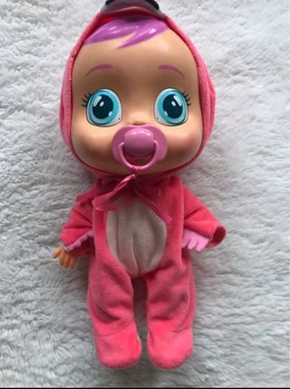 Muñeco bebé llorón con un adorable traje de pelícano. - Traje de pelícano en color rosa. - Detalles en blanco en el traje. - Lazos rosas en el traje.