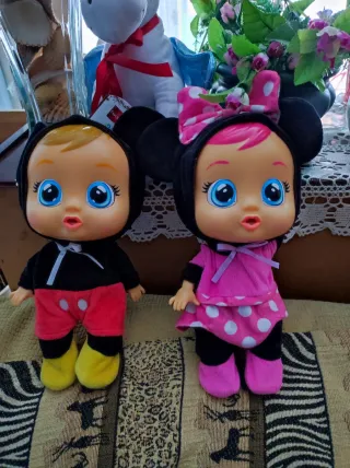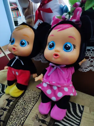 Set de dos muñecos Cry Babies inspirados en Mickey y Minnie Mouse. Son perfectos para coleccionar o regalar. - Muñeco estilo Mickey Mouse con traje rojo y negro. - Muñeca estilo Minnie Mouse con vestido de lunares rosas. Perdieron el chupete rosa y azul, de ahí su precio tan barato. Bebés llorones. Se venden tal y como aparecen en las fotos. Hago envíos por Wallapop.