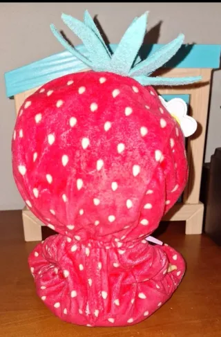 Muñeco bebé llorón con un adorable traje de fresa. - Traje rojo con estampado de fresas blancas. - Capucha con detalles de hoja verde. - Chupete rosa incluido.