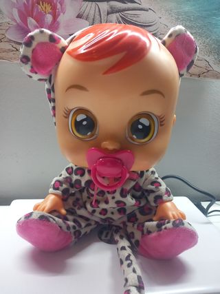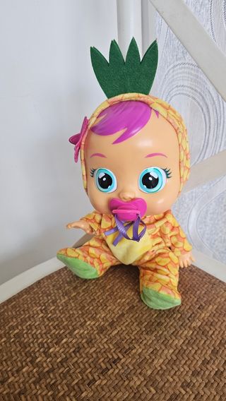 Bebé Llorón Tutti Frutti. Se llama Pia. Funciona perfectamente. Viene sin la caja. Se sacó de su caja y desde entonces ha estado en estantería sin usarse. Es articulado. se mueven las piernas y brazos. Si no le pones el chupete, llora :) Está nuevo. Viene con pilas incluidas y funciona perfectamente. Nuevo vale entre 34€ y 39€ dependiendo del sitio
