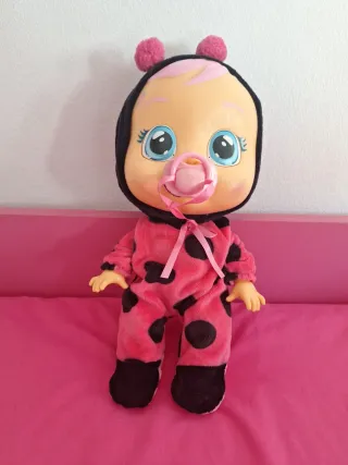 Muñeco bebé llorón con un adorable disfraz de mariquita. - Disfraz de mariquita con puntos negros. - Capucha negra con antenas rosas. - Chupete rosa.
