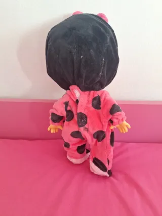 Muñeca Bebe Lloron con un adorable diseño de mariquita. - Pelo rosa. - Traje rosa con manchas negras. - Incluye chupete rosa.